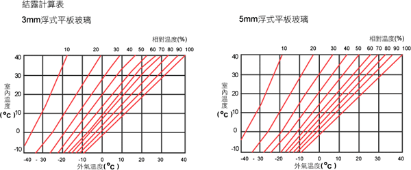 圖5-1所示結露計算圖係經電腦計算所做成,只要能確定玻璃的結構,室內濕度、室內溫度、外氣溫度之中的3個條件之值,可由此可求得開始結露狀態的另一數值。